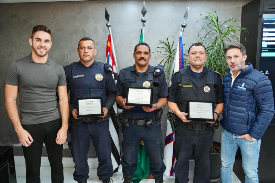 Em um gesto de reconhecimento e valorização aos profissionais que diariamente arriscam suas vidas em defesa da população, o prefeito de Cajamar, Kauan, prestou nesta terça-feira (21) uma homenagem especial aos guardas municipais Sinval Aparecido, Márcio Batista e Francisco Irlan, que atuaram com rapidez e coragem para salvar a vida do pequeno Theo Castelo, um bebê que se engasgou e correu risco de vida.